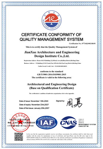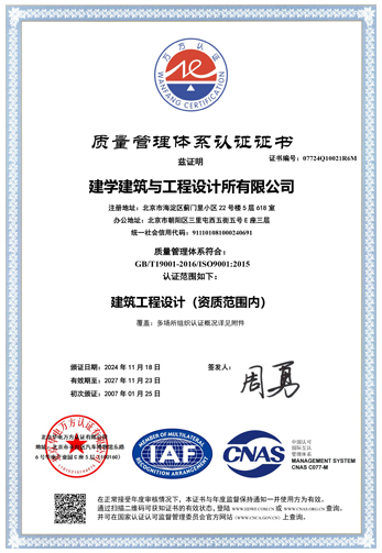 2002年,建學(xué)為提高設(shè)計(jì)質(zhì)量,投保建設(shè)工程設(shè)計(jì)責(zé)任保險(xiǎn),至今零索賠記錄。2007年,公司通過了ISO9001質(zhì)量管理體系認(rèn)證,經(jīng)過16年的運(yùn)作,做到對(duì)全國(guó)各分公司設(shè)計(jì)產(chǎn)品和服務(wù)全部覆蓋。